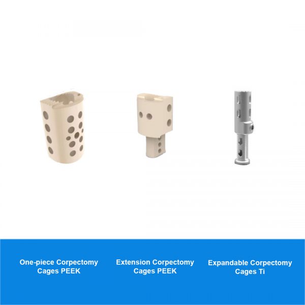 Monobloc corpectomy cages are available in size 11 and then from size 12 to 30 (with a size increment of 2mm). Two sizes of extensors are also available and intended to be assembled to the corpectomy cages. The association of extensors and corpectomy cages allows to supplement the range with cages ranging from size 32 to 58. Preclinical evaluations have been performed and tests with in vitro manipulation were performed to evaluate the interaction of implants with the associated instruments.